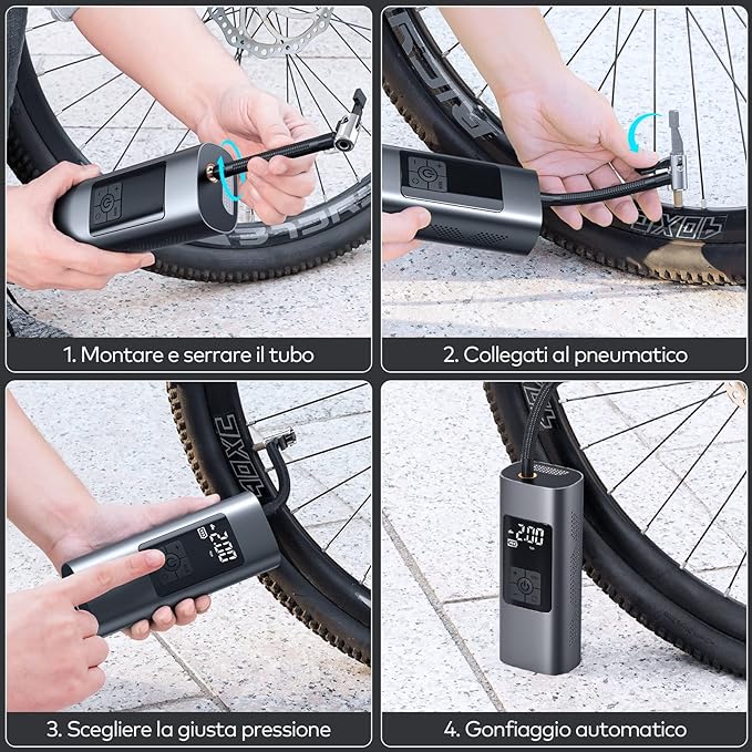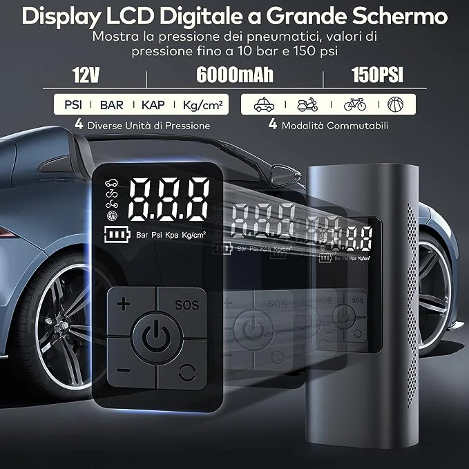 Gonfiaggio Automatico e Multifunzione: Basta impostare la pressione desiderata e il gonfiatore si fermerà automaticamente una volta raggiunta per prevenire il sovraccarico. Puoi scegliere tra 4 unità di misura (PSI, BAR, KPA, Kg/cm²), con una pressione massima di 150 PSI. Per prestazioni ottimali, si consiglia di caricare completamente il dispositivo e di fissare saldamente il tubo per evitare perdite d'aria.